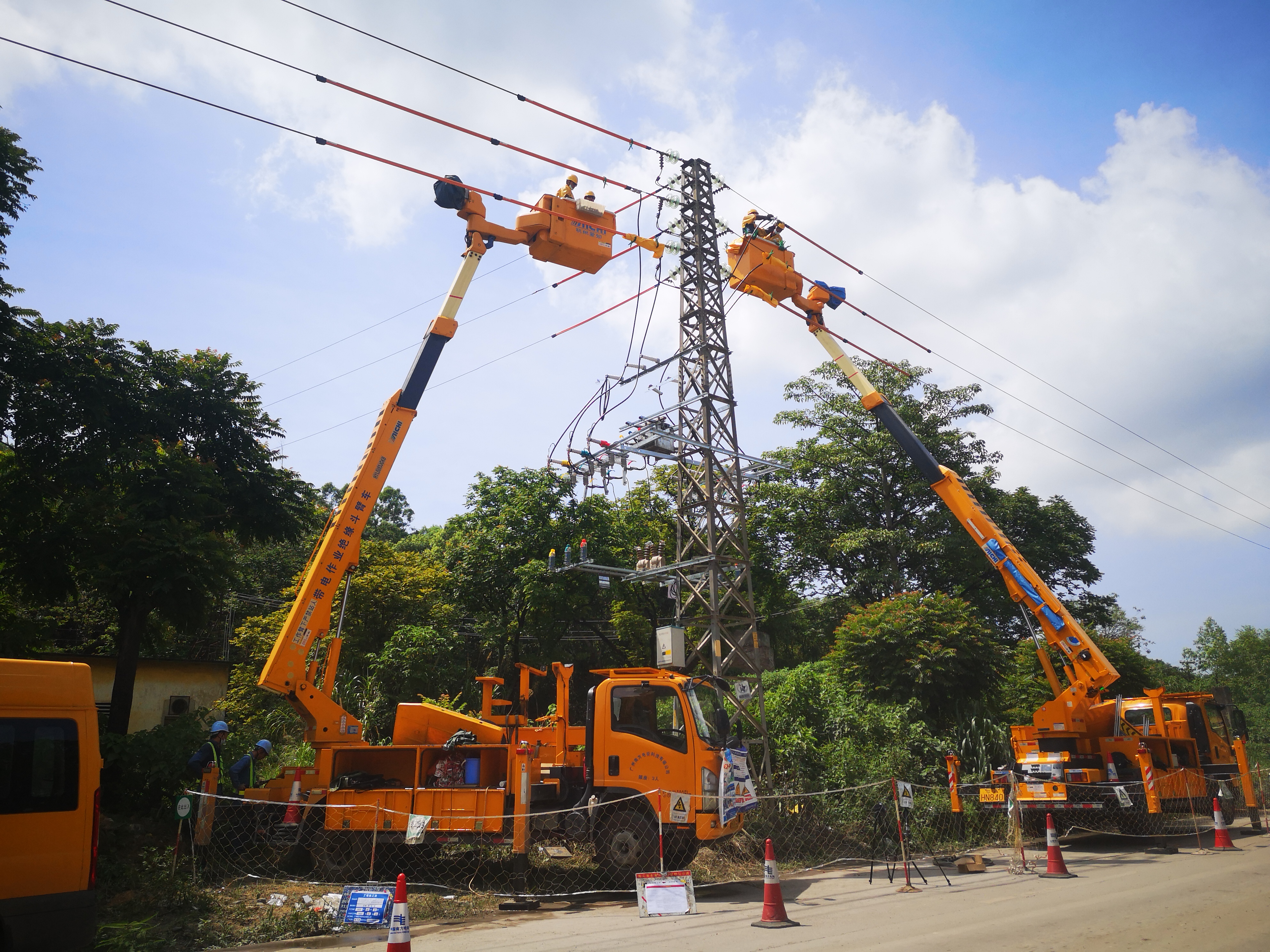 广州花都供电局在石塘村镜湖工业园进行带电作业,更换柱上自动化开关。