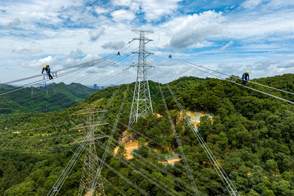 南方电网深圳供电局工作人员在大湾区送深通道工程开展高空走线验收。