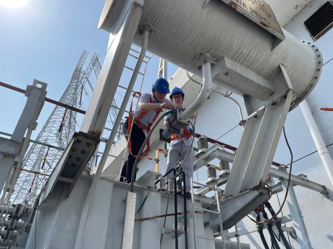 葛洲坝电厂员工顶着烈日更换变压器瓦斯继电器。