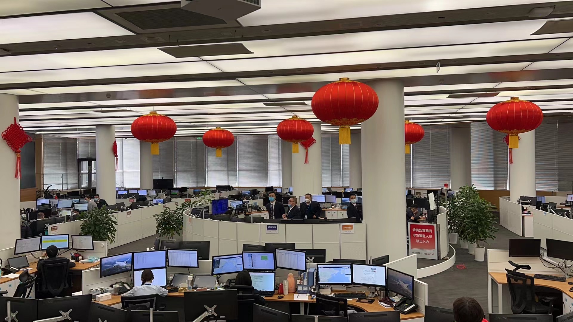 除夕之夜,当全国人民开始倒计时,迎接兔年新春之际,东航运控中心OCC大厅依然灯火彻夜通明。墙上巨大的显示屏上,实时记录着当天航班运行情况、天气情况等信息。与平时唯一的区别便是大厅里高高挂起的大红灯笼和装点在各处的新春摆件,这让24小时值班的员工们感受到了过年的喜庆氛围。