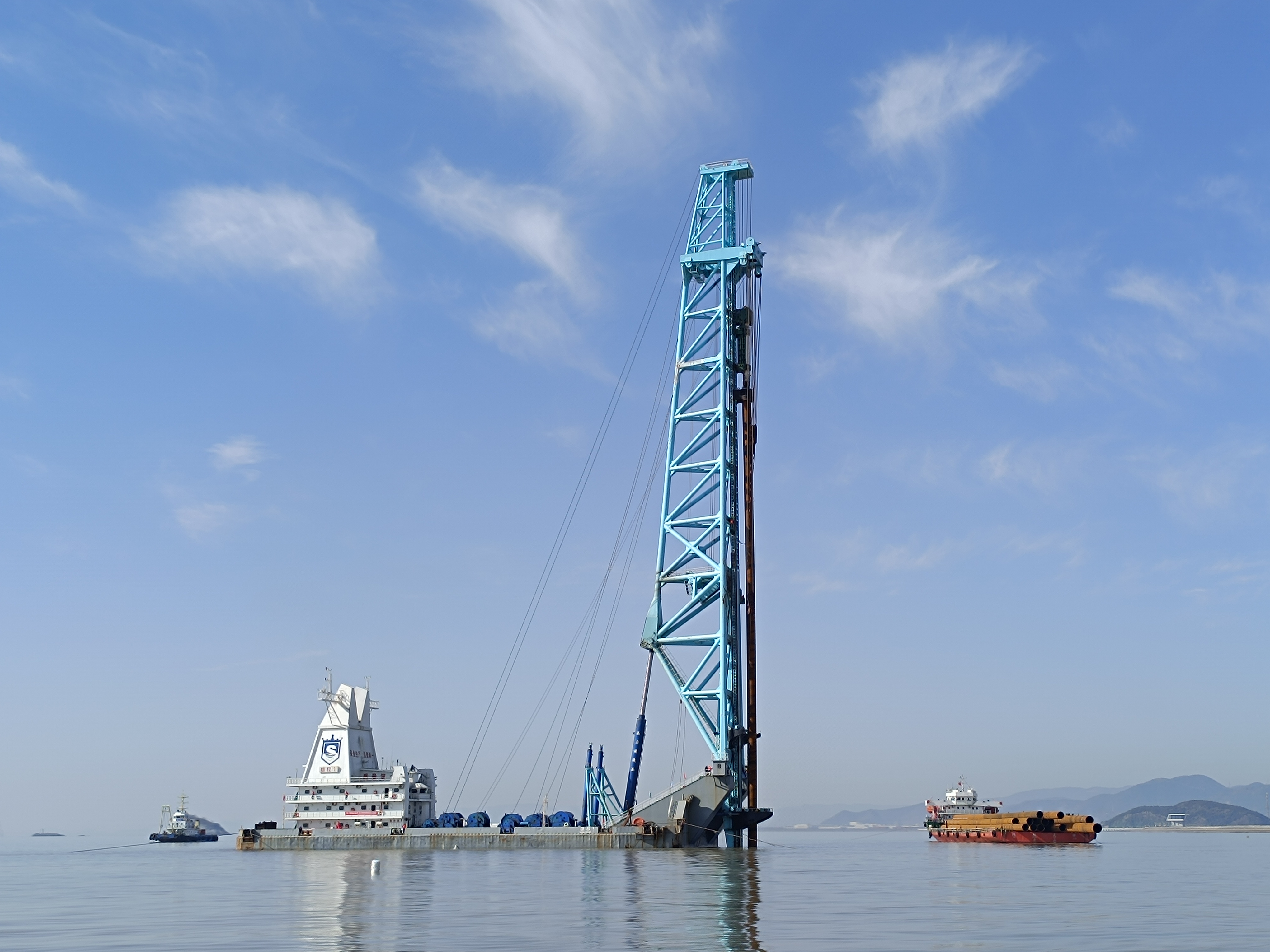 六横大桥二期工程为大型跨海连岛工程,由多座桥梁及连接线构成高速公路通道。全线共设主线桥梁约17.76公里,其中特大桥约16.88公里,包含双屿门特大桥、青龙门特大桥两座世界级跨海大桥。青龙门特大桥是世界跨度最大的三塔钢箱梁斜拉桥,双主跨756米横越大海,采用半漂浮体系设计,主塔为钻石型塔,三塔高度均为249米。此次试桩施工位于青龙门西引桥近梅山侧。