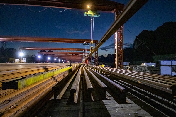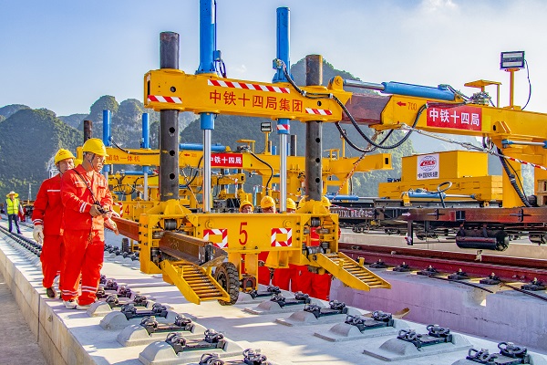 贵南高铁广西段沿途为典型的喀斯特地形,穿越110多座桥梁,45座隧道,桥隧比高达90.3%,对铺轨作业带来巨大考验。为加快铺轨进程,中铁十四局联合厂家研发新型多线铺轨一体机,同时引进多台先进铺轨设备,与传统无砟铺轨机联合作业,施工效率提高了50%。自2022年8月铺轨以来,项目团队严格标准化管理,不断加大科技攻关,持续创新工装工艺,创下了日铺轨最高达12公里的佳绩,提前15天完成了南宁至河池段既定的铺轨任务。