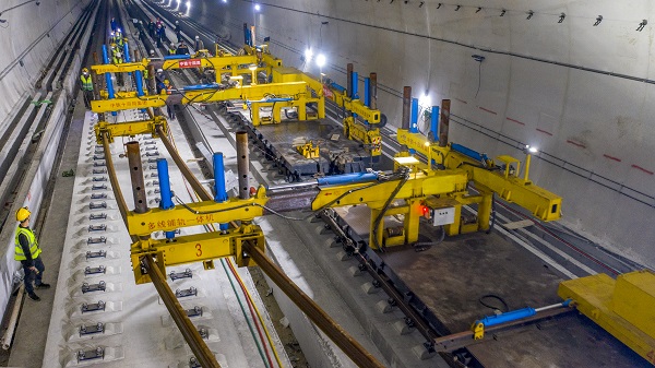 图为多线铺轨一体机在贵南高铁大方山隧道内作业