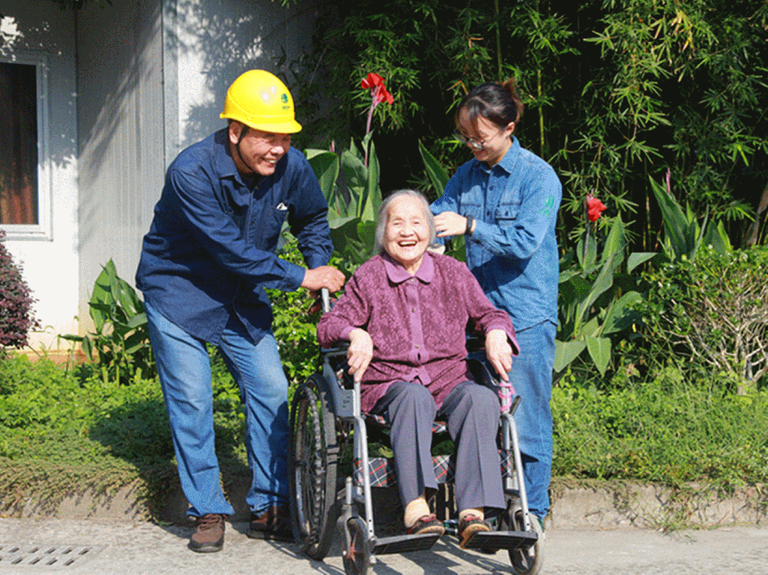 枫桥供电所员工陈仲立、许莹到诸暨枫桥敬老院看望老人并聊家常