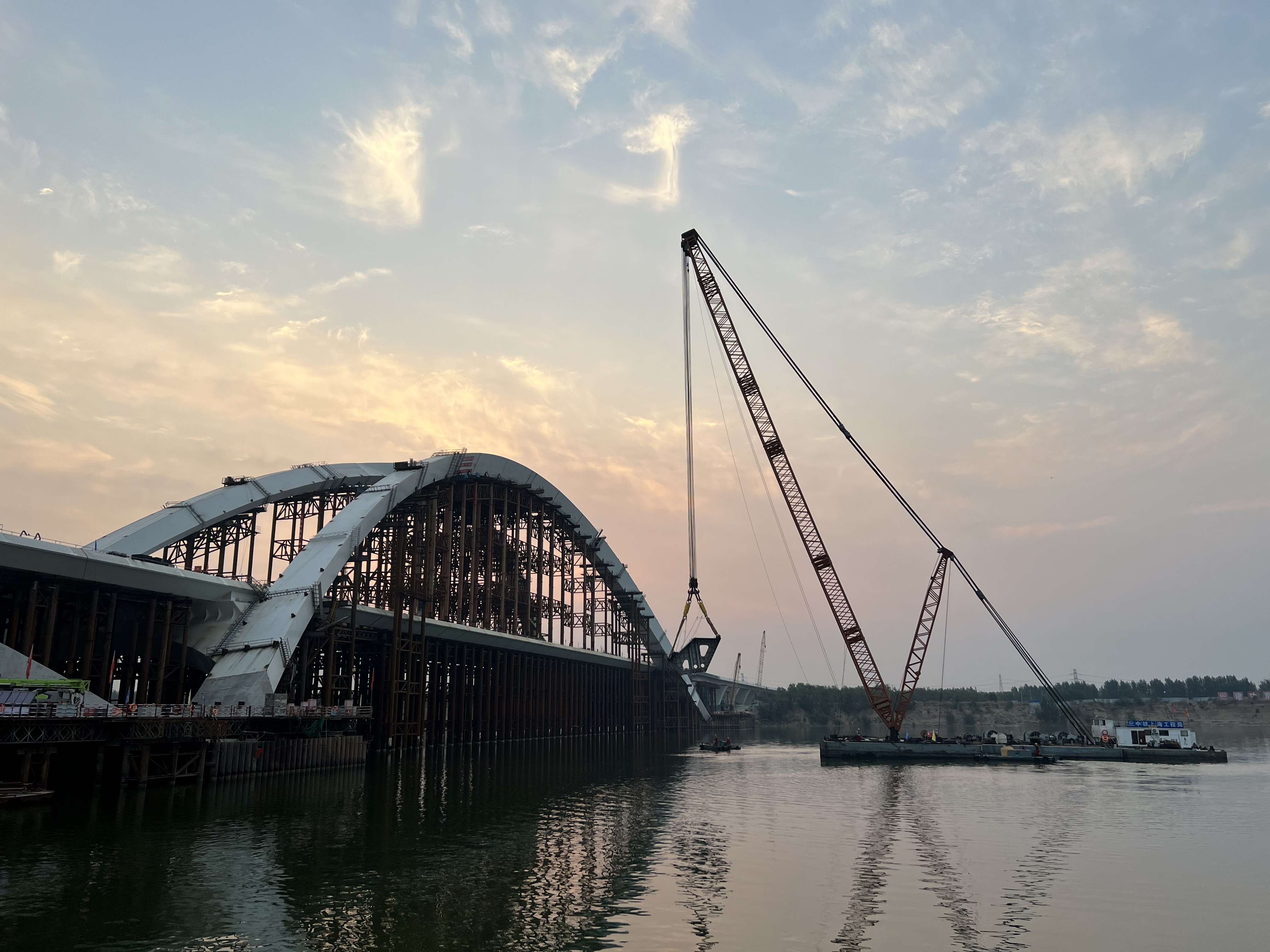 大桥主桥采用飞燕式拱桥结构,桥梁拱肋和主梁均采用钢结构设计,共用钢材2.2万吨。为了方便加工制造和吊装,全桥钢结构共划分成126个形态各异的钢“积木”,单个最重240吨,最大的长度48米、宽9米,采用两台200吨级液压模块车运输。项目团队利用2台610吨浮吊进行安装施工,这也是北京首次在不通航水域引入大型浮吊用于桥梁建设。施工过程中,项目部充分利用360度无死角监测系统,实时显示吊装关键指标,精准把控拱肋翻身、起吊、行走、就位等环节,并采用三维液压千斤顶“精调”,确保了钢结构精准安装。