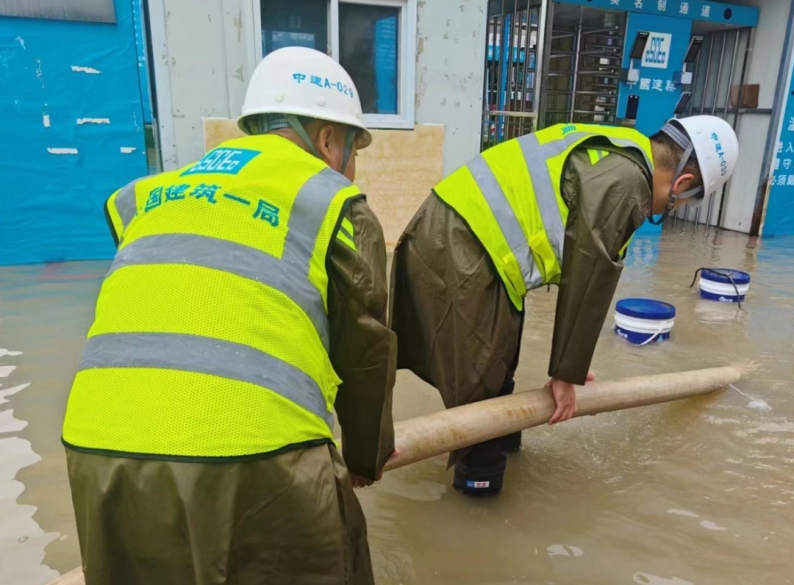 中建一局所属在京项目通过垒筑防洪沙袋、运转大功率抽水机紧急排水、夜间组织人员通宵值班巡查等举措,全力抢救物资,把损失降到最低,并配备防汛沙袋、塑料布以及水泵、挖机等进行排水防汛,确保安全度过汛期。