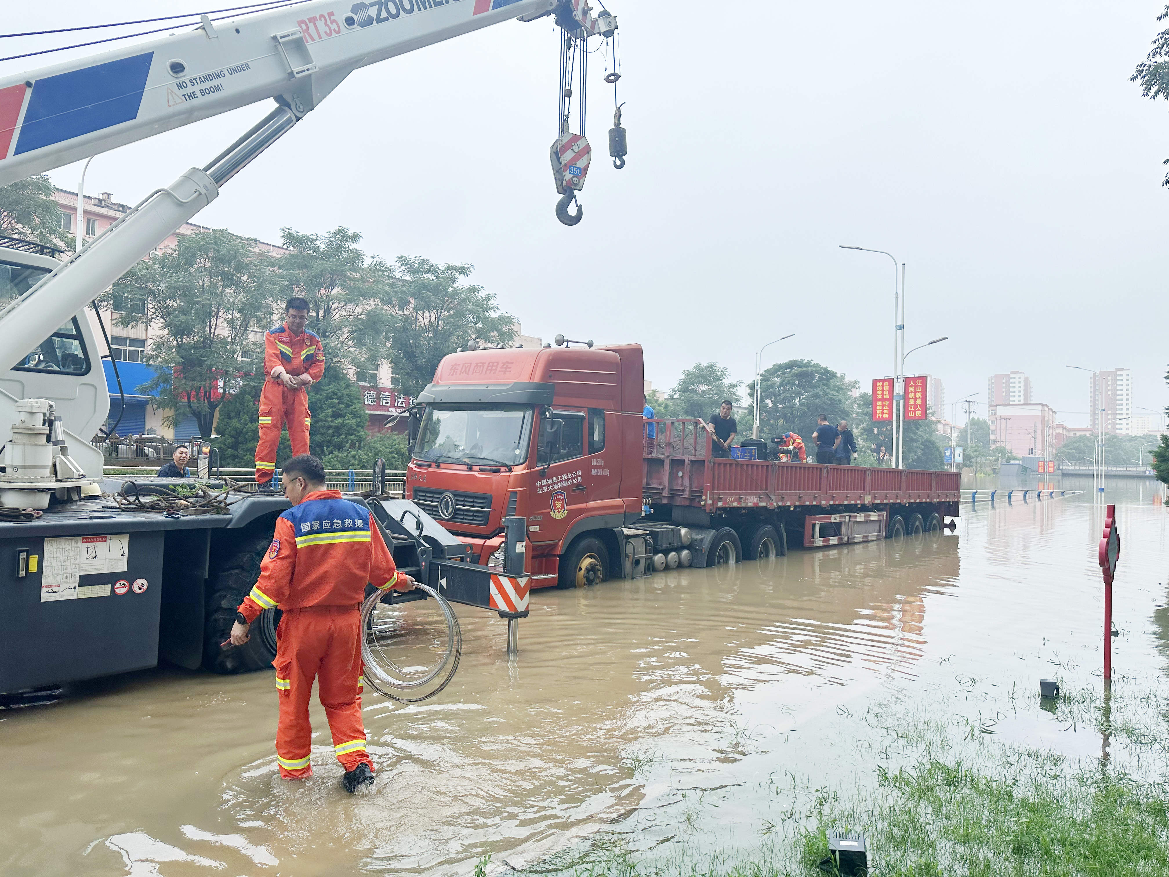 8月1日,中煤地质总局所属的国家矿山应急救援大地特勘队接到政府请求,第一时间集结人员及救援装备,立即出动14名队员、2辆应急指挥车、2辆35吨吊车、2辆30吨半挂车等国投装备和1辆集成发电照明车及4台大排量水泵,前往受灾较为严重的华阳桥和冠云桥附近开展紧急救援工作,全力以赴保障居民生命安全。