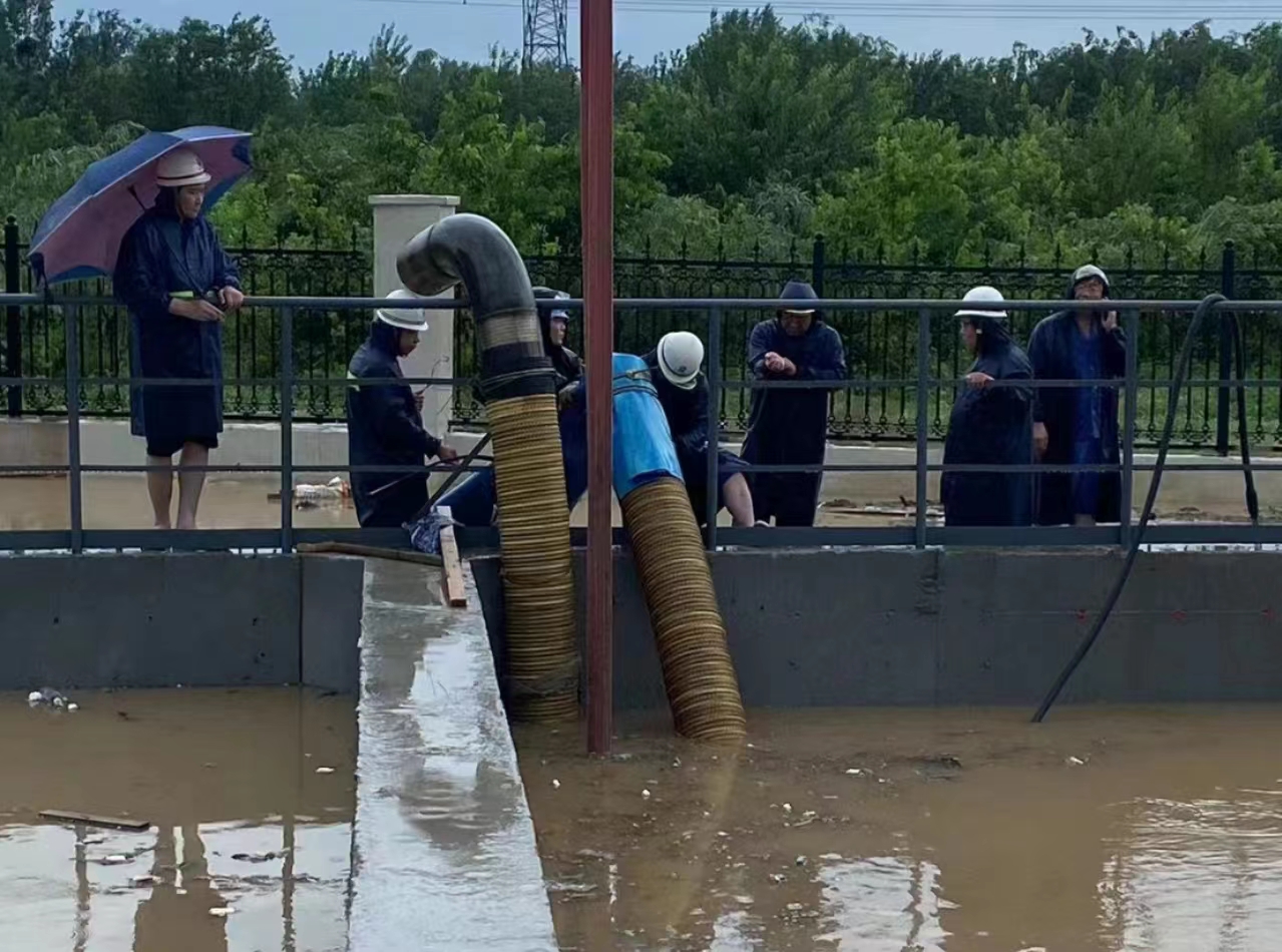 华北铝业干部职工冒雨挖通蓄水池围堰、增设排水泵。