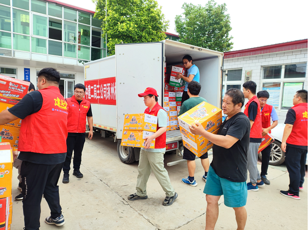 在河北涿州,中建二局“砼心筑梦”志愿服务队为涿州范阳医院送去救生衣、矿泉水、面包、牛奶、八宝粥等救援物资。中建二局涿州松林店项目主动对接涿州市总工会,积极筹备救灾物资,项目党员、青年员工奔赴大马村和东庄头村配送矿泉水、方便面等生活物资。