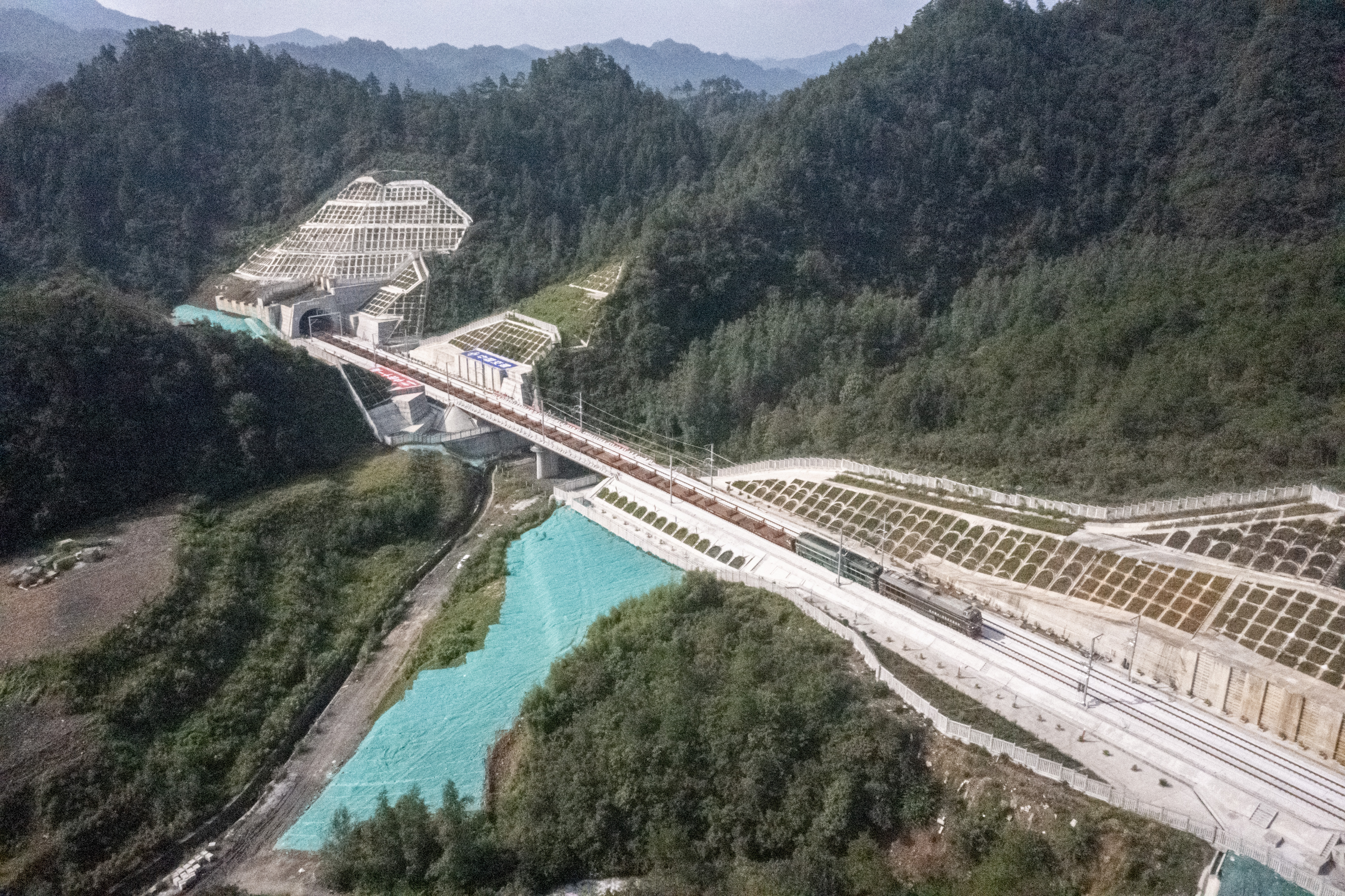 池黄高铁是武汉至杭州高速铁路通道的重要组成部分,线路起自池州站,至黟县东站与在建昌景黄高铁共站并线至黄山北站,新建正线长约125公里,设计时速350公里。全线设池州、九华山、黄山西、黟县东、黄山北等5座车站,设有隧道34座,特大、大中桥梁55座,桥隧比高达89%。沿线山高谷深,沟壑纵横,地形地貌复杂,长钢轨加固、运输、铺设难度大,精度要求高。