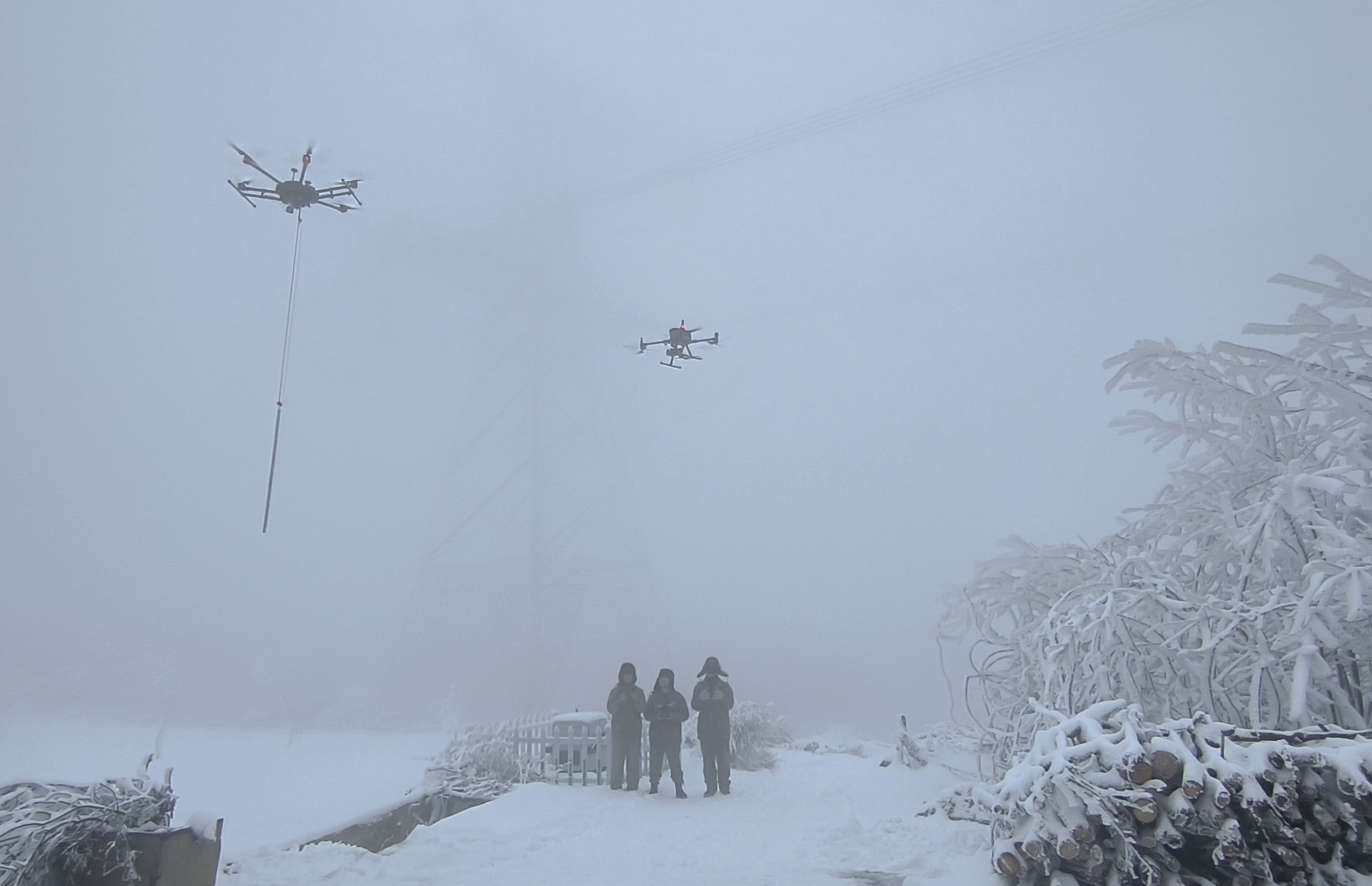 湖北出现大范围雨雪冰冻天气。2月2日6时,位于湖北秭归县的500千伏盘宜线形成了厚厚的覆冰。国网湖北电力设置的“观冰”监测装置将预警信息发送到监控员手机上,工作人员根据预警信息,打开无人机机巢操作系统,一架无人机腾空穿越可见度仅5米的云层,自主对该区段多基杆塔进行巡检。10时许,一架六旋翼无人机下方悬挂的条状重物,撞向500千伏盘宜线地线,线上的覆冰随着撞击掉落。
