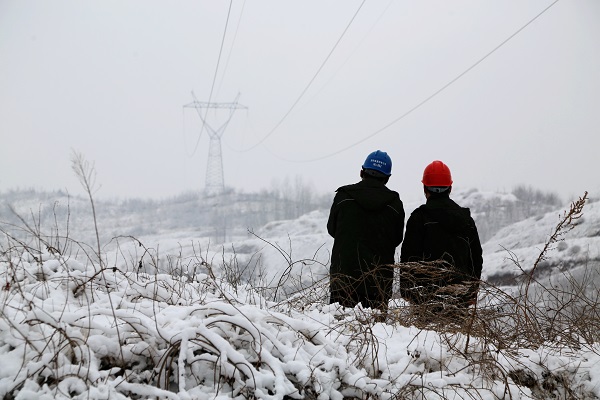 国网河南洛阳供电公司员工冒雪特巡220千伏福栾线。