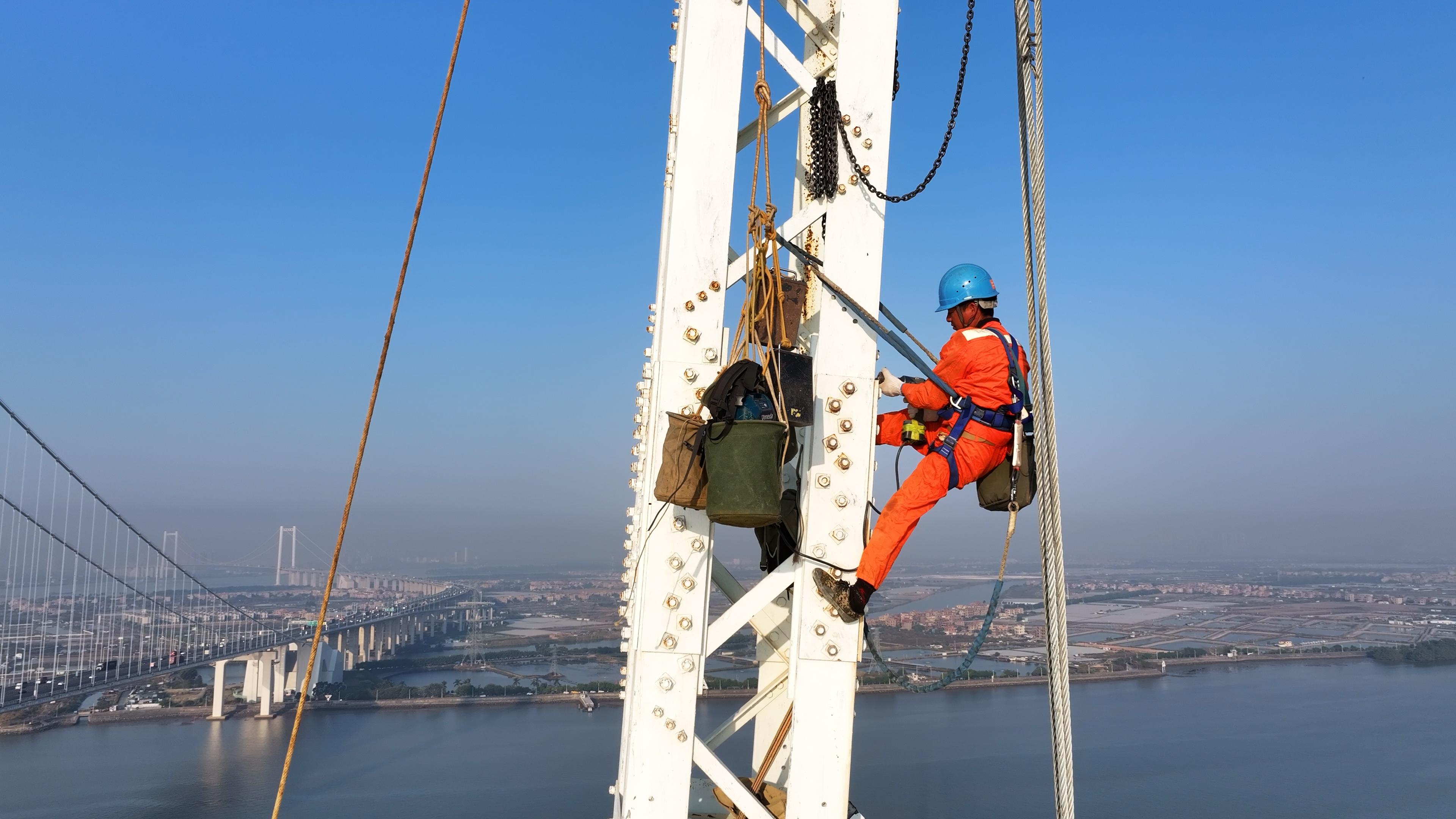 面对复杂的施工环境,陈劲松和徐敏花了不少功夫琢磨如何“绣花”式拆塔。为了尽可能降低拆除风险,项目全面使用机械化施工,在海上原有塔基平台四周搭设约8300平方米的钢桁架平台用于施工,运用新型双平臂落地抱杆、攀爬机等数智化手段进行海上大跨越塔的组立拆除,大大提升工作效率、降低安全风险。