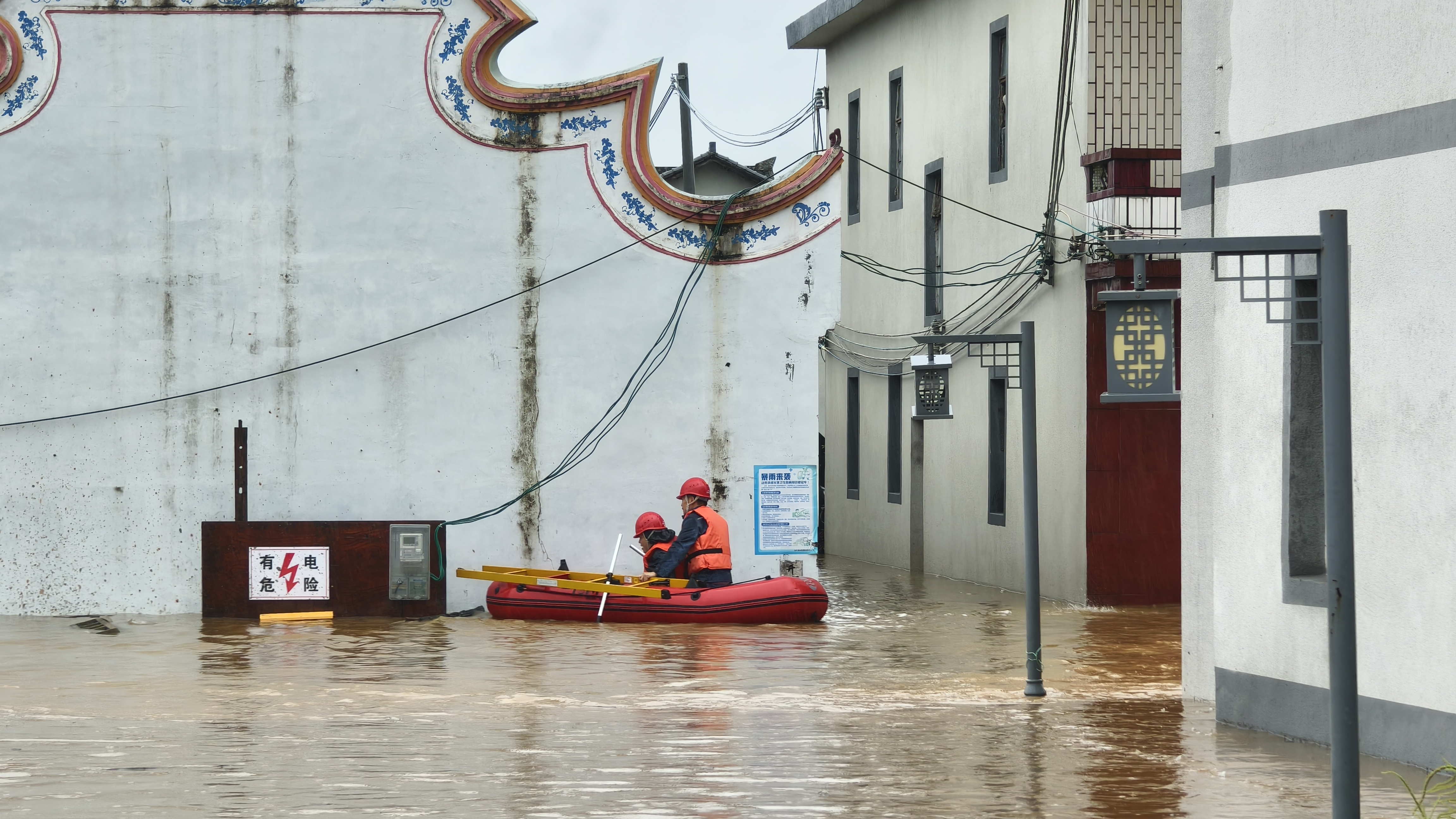 6月17日上午,河源连平县油溪镇茶壶耳村被洪水包围,祠堂前的积水超过1.5米。南方电网广东河源连平供电局油溪供电所副所长张建明拿出提前备好的冲锋艇,带着同事向“孤岛”挺进。