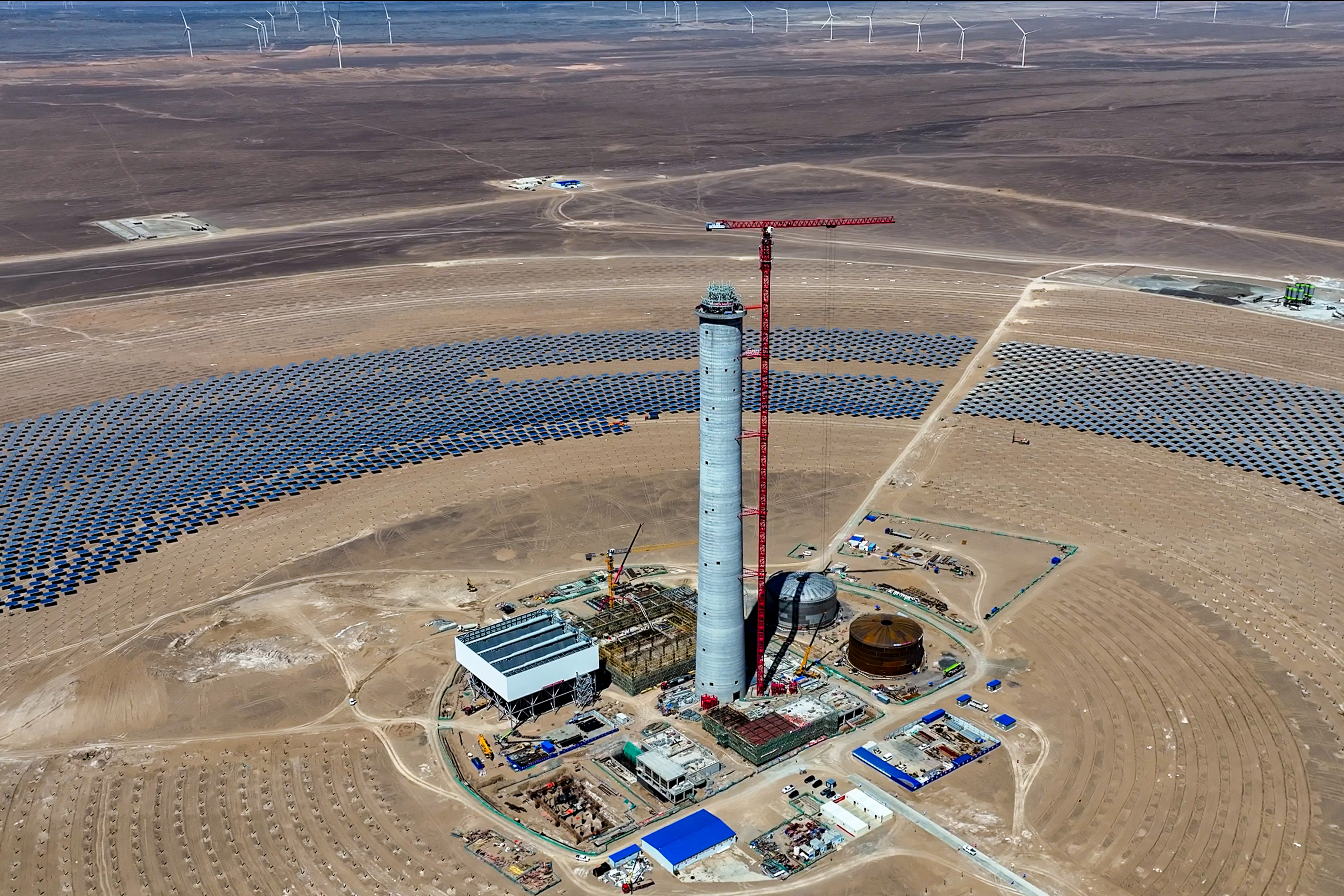 哈密市是疆电外送的重要基地。该项目设计总装机容量1500兆瓦,其中包含1350兆瓦光伏和150兆瓦光热,建成后将通过储热型光热电站调峰能力,有效解决光伏间歇性、不稳定性问题,为构建以新能源为主体的电力系统,探索“光(热)储”一体化开发作出示范。示范项目成功地将光伏发电与光热发电深度融合。日间,主要依赖大容量的光伏组件发电;夜间,由光热电站担纲主角,其配套的8小时高温熔盐热系统无缝接续,持续稳定输出电力,有效转化传统光伏发电固有的间歇性和波动性问题。建成后,示范项目年均可提供近29亿千瓦时的绿色电力,相当于节约标准煤86.8万吨,减排二氧化碳225.6万吨,将为加速新疆能源结构绿色低碳转型,助力实现“双碳”目标,提供了坚实的技术支撑和实践蓝本。