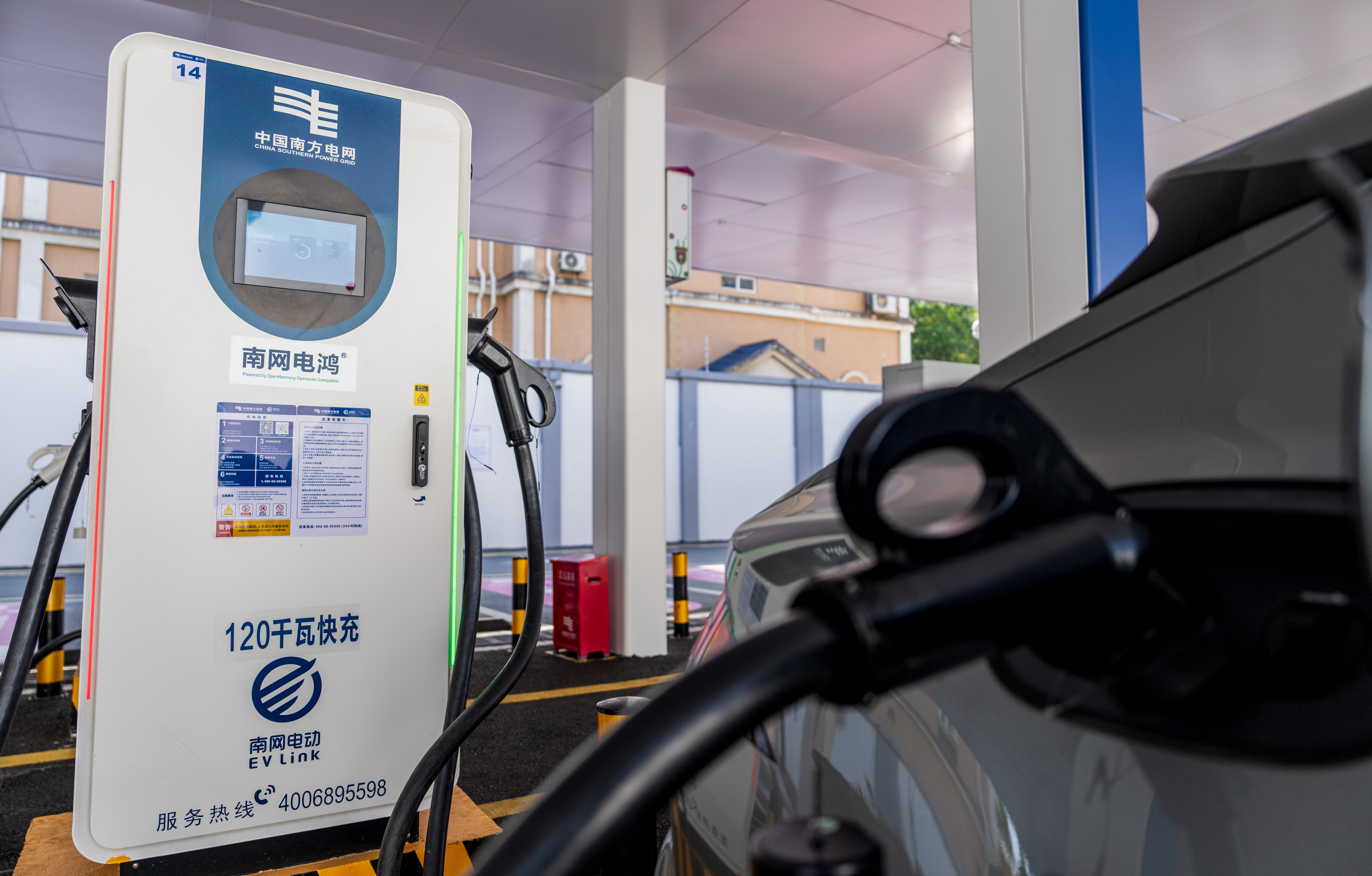 在莲花山超级充电站内,新能源车辆使用搭载电鸿系统的快充桩充电。