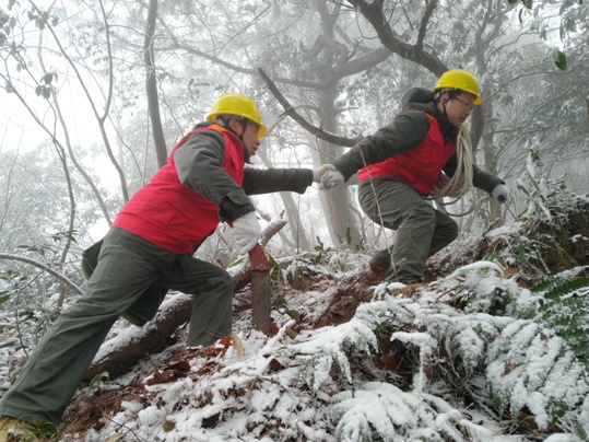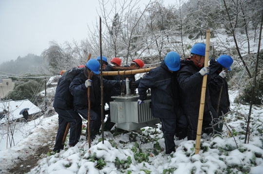 安徽绩溪供电公司员工抬着变压器在雪地里艰难前行