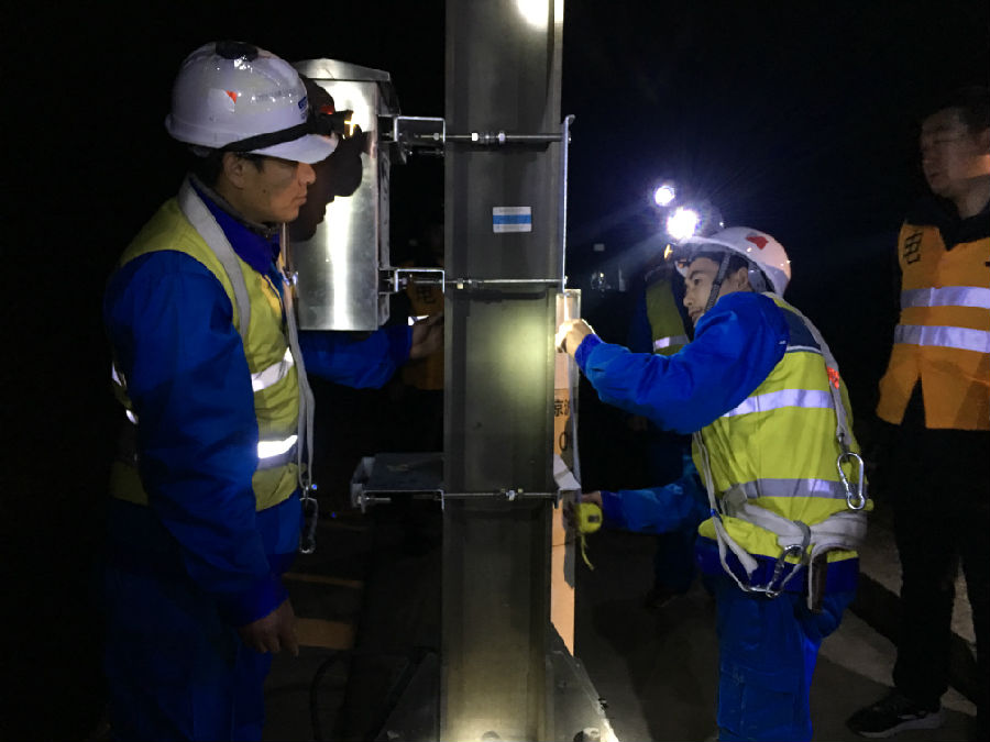 本次视频补强工程是高铁既有线施工,在确保圆满完成施工任务的同时,还要保证京沪高铁白天的正常行车,因此,所有施工工作必须在凌晨0点30分至4点30分之间的“天窗点”完成。为确保高效、圆满完成好工作任务,中国通号京沪高铁视频补强工程项目部采取“全线推进、分段施工”的方法,每天安排30余组作业队、1300余人同时在京沪高铁全线作业。为确保夜间施工的安全、高效,项目部有针对性地制定了《高铁机具、材料上线登记表》和《高铁作业人员登记表》。同时积极创新工作方式方法,突破以往敷设电缆的方式,采用了穿线器、光电缆、滑轮相配合的方式,有效减少了电缆阻力,解决了电缆磨损问题,大大提高了工作效率。经过133天的奋战,圆满完成了全线1318公里24个车站、235.06公里路基地段、310处桥梁救援疏散通道、电力分相视频监控补强工程和路基段两侧各1条24芯光缆和电缆的敷设、接续和控制箱安装等施工任务。