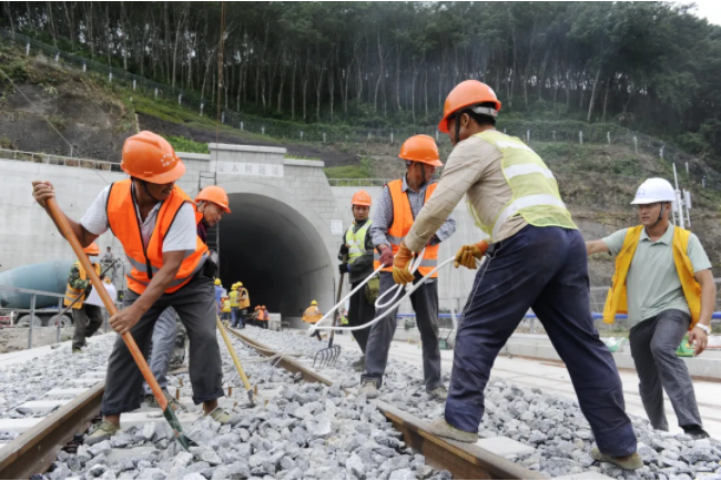 2020年4月中老铁路国内玉溪至磨憨段开始铺轨,由于桥梁、隧道等控制性工程建设制约,铺轨施工受到一定影响。为安全优质完成铺轨任务,施工人员24小时四班倒,操纵两台铺轨机同时在上下行线路上铺轨,做到人停机不停,今年2月再次增加磨憨至玉溪方向反向人工铺轨作业,全力推进全线铺轨完成。