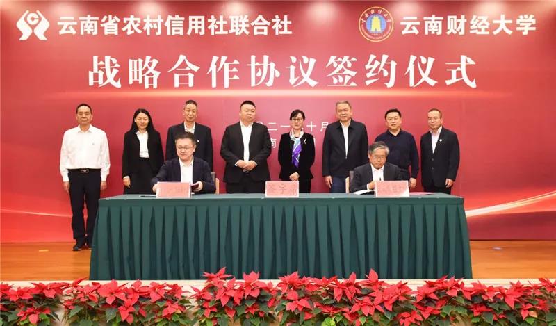 10月12日,云南省农村信用社联合社与云南财经大学签署战略合作协议。此次协议的签订是双方促进银校共同发展和长远合作的重要举措。双方将本着自愿、平等、互利、守信的原则,建立“优势互补、资源共享、平等互利、共赢发展”的战略合作伙伴关系,在金融人才培训培养、联合科研攻关、金融创新实践等方面开展务实合作。