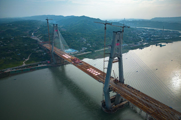 自贡至宜宾段全长81.7公里,共有桥梁104座,隧道10座。其中,最重要的控制性工程——宜宾临港长江大桥已于5月31日顺利合拢。该桥全长1742.1米,桥面宽63.9米,主跨522米,是世界首座采用公路和高速铁路平层布置的桥梁。渝昆高铁、蓉昆高铁将共用此桥作为过江通道。大桥建成后将成为世界上宽度及跨度第一的公铁两用钢箱梁斜拉桥。