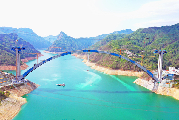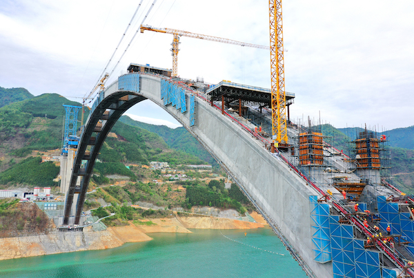 南丹至天峨下老高速公路天峨龙滩特大桥位于广西河池市天峨县龙滩大坝上游6公里处,横跨红水河,全长2488.55米,主桥为跨径600米的上承式劲性骨架混凝土拱桥,是世界最大跨径拱桥,被列为国家交通运输行业重点科技项目。特大桥劲性骨架外包C60混凝土浇筑方量共计27994立方米,重72784吨,分底板环、腹板环、顶板环三个施工环节,采用3环6段8工作面工艺平衡加载。
