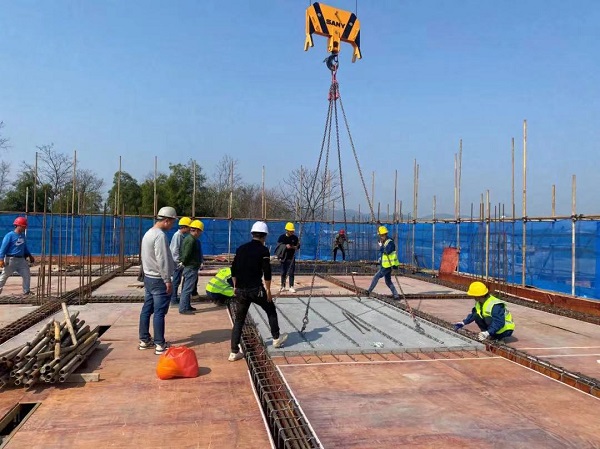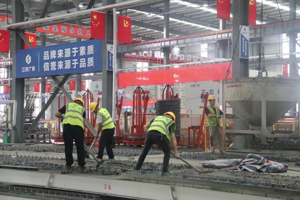 在PC生产车间里,生产工人身穿工作服,头戴安全帽,各司其职、紧张有序地开展工作。在钢筋加工区,有人正忙着加工钢筋、制作网片;在PC生产线的模台上,有人忙着清模、装模,安装预埋件;在布料机前,操作员一丝不苟完成布料,一块块PC板依次成型;在养护窑口,有人在忙着将养护完成的PC板吊装到成品区;在堆码区,有人忙着为即将发出的PC构件做最后的准备。大家的身上早已是汗如雨下,汗透了衣服。