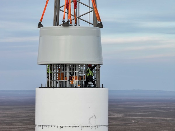 该首台套风电机组并网,标志着全球规模化商用最大混塔风力发电机组在内蒙古能源集团成功发电运行。项目使用的风电设备单机容量10兆瓦,混塔高134.4米,整机高度140米,叶片长112米,风轮直径230米,覆盖及扫风面积更大,经济性和发电量相对更高。值得一提的是,此项目风机塔筒由钢筋混凝土中空、重力式基础+上部高强混凝土预制管片叠合而成,是国内首次采用内张拉、预应力技术的10兆瓦混塔风力发电项目。塔筒内部预留孔洞固定钢缆,钢缆固定后进行水泥灌浆填充缝隙,风机运行中旋转产生摆动,使用此技术,在摆动时,塔筒内部结构均匀受力,整体摆幅程度大大降低,使塔筒整体性更好、耐久性更强、预应力损失小,混塔结构塔筒优势突出。