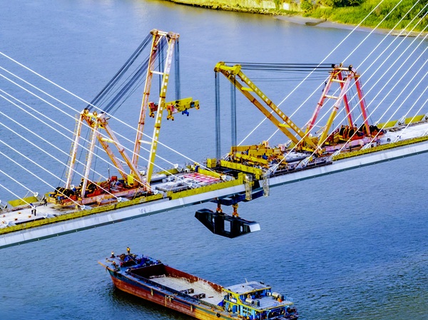 广湛高铁跨东平水道斜拉桥合龙段吊装