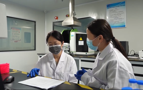 周荃(左一)在生态环境实验室监测土壤样品测试数据
