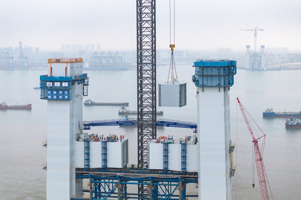 除了打造智能建造生产线,项目还创新研发了可移动式智能端面铣设备、数字化预拼装技术,打造了国内首套剪力钉自动焊接生产线,确保钢壳制造标准化、精准化。钢横梁节段在工厂内快速拼装成型,再整体运输至现场完成吊装,该工艺不仅能有效降低高空作业安全风险,还切实提升了桥塔工程建造品质。