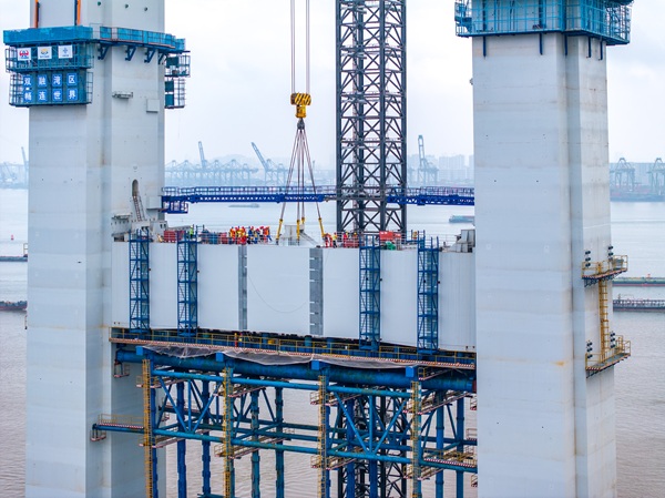 狮子洋大桥是项目关键控制性工程,采用双层钢桁悬索桥方案“一跨过江”,建成后将创造双层悬索桥“主跨跨径、主塔塔高、锚碇基础、主缆规模、车道数量”五项世界第一。大桥主跨长2180米,主塔为门塔式结构,高342米,相当于110层楼高,是世界最高的双层悬索桥主塔,采用钢板—混凝土组合结构,塔柱自下而上由62个钢壳节段以及6道钢横梁构成。主塔首道钢横梁如大桥的“肩膀”,支撑起桥面和未来桥上过往的车辆。该横梁是全桥最重的横梁,重量超1200吨,由7个节段组成。