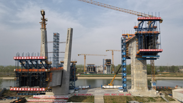 在宁淮城际铁路5标施工现场,跨滁河220米斜拉桥矮塔已于近期完成封顶,该矮塔采用V型斜塔柱,塔高47米,塔身采用C55高性能混凝土,浇筑方量2046.8立方米,大里程梁体共25个节段,现已施工至6#节段。此桥为全线跨度最大、技术含量最高、施工难度最大的关键性控制工程。另在相距不足50米的北沿江高铁建设现场,跨滁河210米钢混混合连续刚构大里程混凝土梁体已施工至4#节段,完成25%,其余施工正有序进行中。