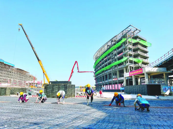 建设团队锚定“地下车库地坪浇筑完成”、“旅客过夜用房楼层板全部浇筑完成”阶段性目标,科学调配资源,轮班作业,现场投入吊车、泵车等大型机械十余台,统筹抓好安全管理、质量监督、进度推进。