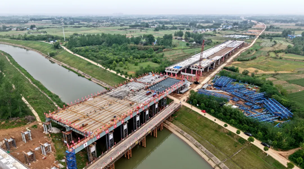 在阜淮铁路站前4标颍河斜拉桥施工现场,机械轰鸣,大干正酣。建设者们奋战在施工一线,全力推进斜拉桥建设,力争今年8月完成大桥合龙。作为全线控制性工程,这座全长489.5米的斜拉桥横跨颍河,施工团队采用智能建造技术,对主塔倾斜度、钢梁拼接精度进行毫米级控制,确保工程安全优质推进。