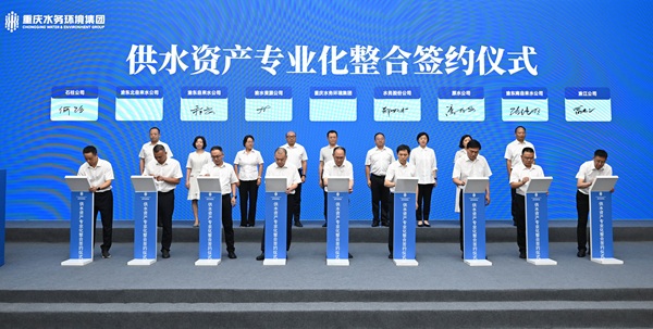 为贯彻落实中央城市工作会议精神和市委六届七次全会部署,深化改革推动“两水”融合,增强企业核心功能、提升核心竞争力,更好服务现代化人民城市建设,重庆启动供水资产专业化整合。8月25日,供水资产专业化整合签约仪式在重庆市国资委举行,重庆水务环境集团所属供水企业水务股份、渝江公司、渝东自来水公司、渝东北自来水公司、渝东南自来水公司、渝水资源公司、原水公司、石柱公司现场共同签约。