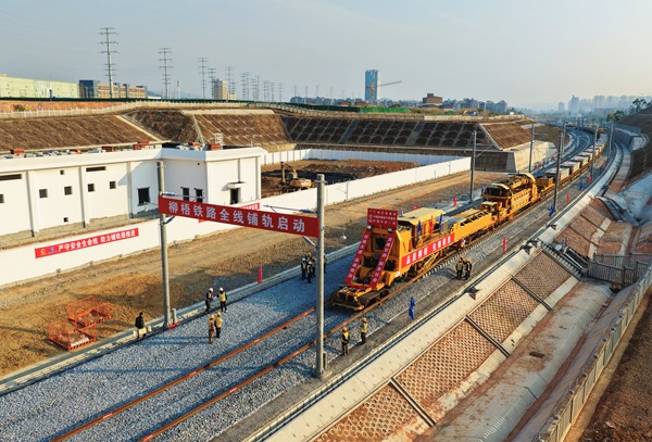 2026年1月6日,柳州至梧州铁路铺轨施工现场机器轰鸣,作业人员熟练操控我国自主研发的CPG500型铺轨机组,将一对500米长钢轨平稳精准地铺设到位,项目正式进入全线铺轨阶段。