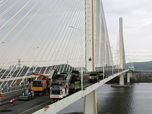 在施工现场可以看到,铣刨机已驶上桥面作业,正在切除大桥旧的路面层。为保护沿线水域生态和空气环境,施工全程使用了洒水车降尘,产生的沥青废料、混凝土残渣等固废,由专用车辆即时收集、统一转运处理,施工污水经临时沉淀池处理后再进行无害处置。