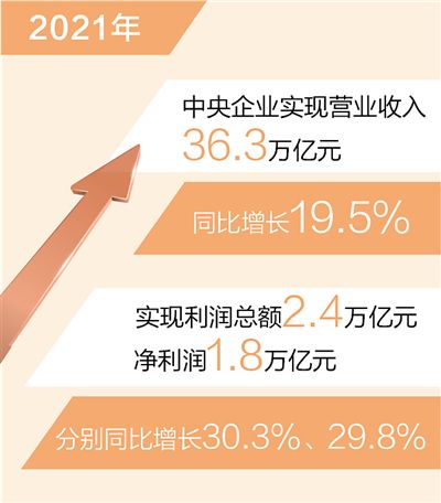 记者从国务院国资委了解到:去年中央企业经营规模、经济效益和运行质量保持稳中向好、快中提质,为我国经济发展作出重要贡献。2021年,中央企业实现营业收入36.3万亿元,同比增长19.5%,两年平均增长8.2%;实现利润总额2.4万亿元、净利润1.8万亿元,分别同比增长30.3%、29.8%,两年平均增速分别为14.5%、15.3%。营业收入、利润总额、净利润等主要指标均创历史最好水平。