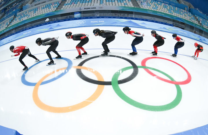 2月18日,参加北京冬奥会速度滑冰集体出发项目比赛的运动员们在国家速滑馆“冰丝带”进行赛前训练。(新华社记者 武巍 摄)