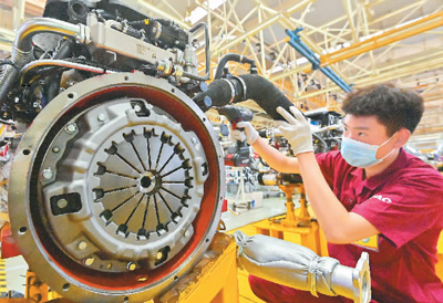4月27日,工人在位于山东省青州市的江淮汽车山东分公司总装车间内组装生产。