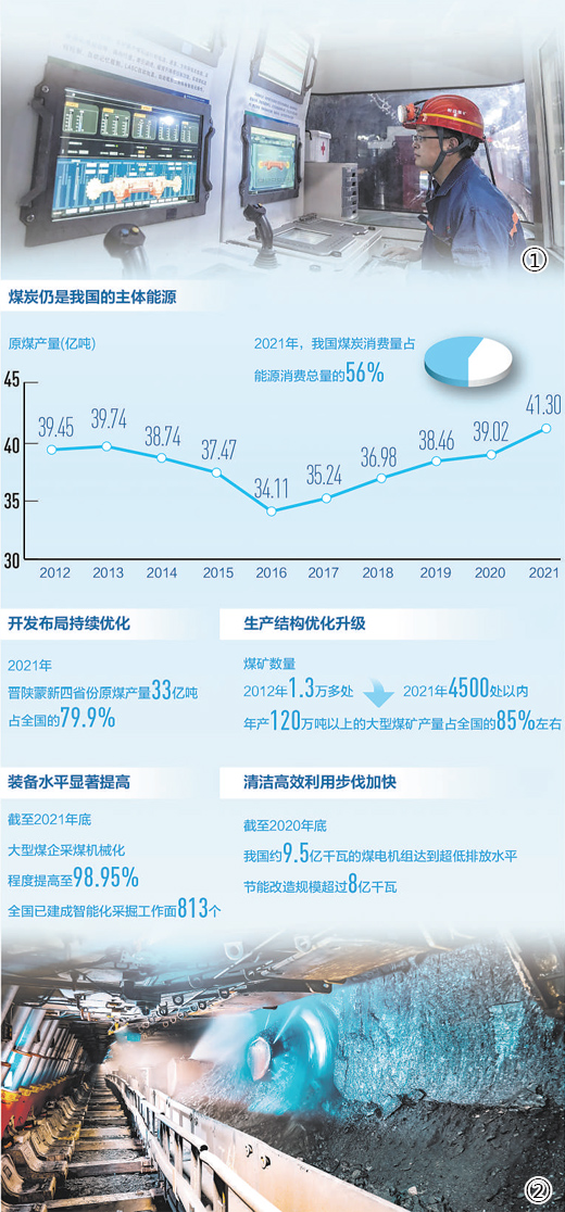 百米深井,一台滚筒直径达3.5米的采煤机开采2500吨煤炭;繁忙港口,一台四翻式翻车机卸载100节火车皮;工业园区,两台660兆瓦燃煤机组生产电能132万千瓦时,满足6600户家庭1个月的用电需求……煤炭保障着经济社会发展和民生用能需求。2021年,我国原煤产量达41.3亿吨,煤炭消费量占能源消费总量的56%,煤炭仍是我国的主体能源。