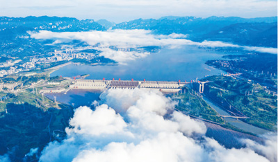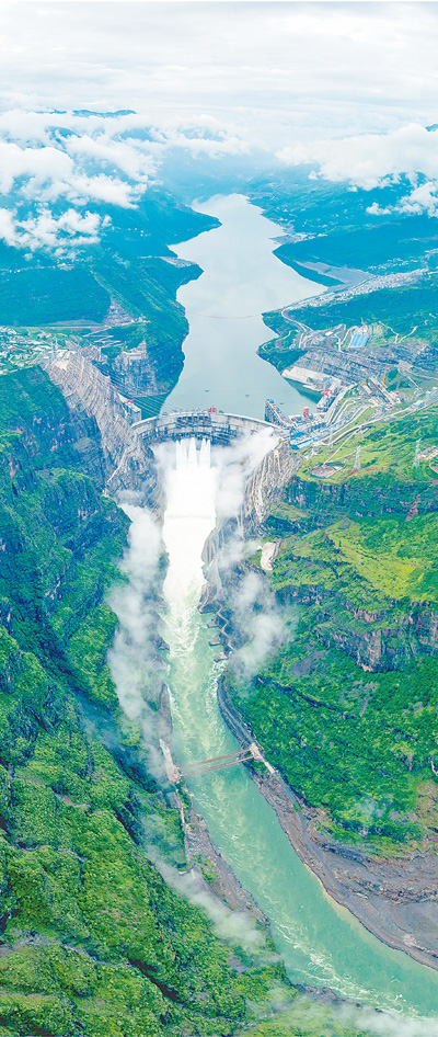 两岸峭壁对峙,长江滚滚东流。自上游向下游,依次分布乌东德、白鹤滩、溪洛渡、向家坝、三峡、葛洲坝6座大型水电站,或长坝卧江,或拱坝抱山,串珠成链,梯级调度,蓄水释能,奔涌江水化为绿色电力,点亮万家灯火,带动机器轰鸣。目前,6座大型水电站多年累计发电量突破3万亿千瓦时,相当于节约标准煤约9.1亿吨,长江干流已经成为世界最大清洁能源走廊。