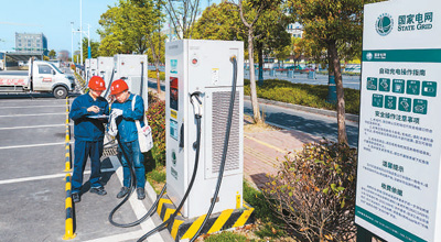近日,在安徽省南陵县籍山镇来邦广场充电站,国网芜湖供电公司工作人员对充电桩进行巡检。