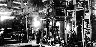 上世纪70年代,工人们正在安装热轧厂粗轧机配件。