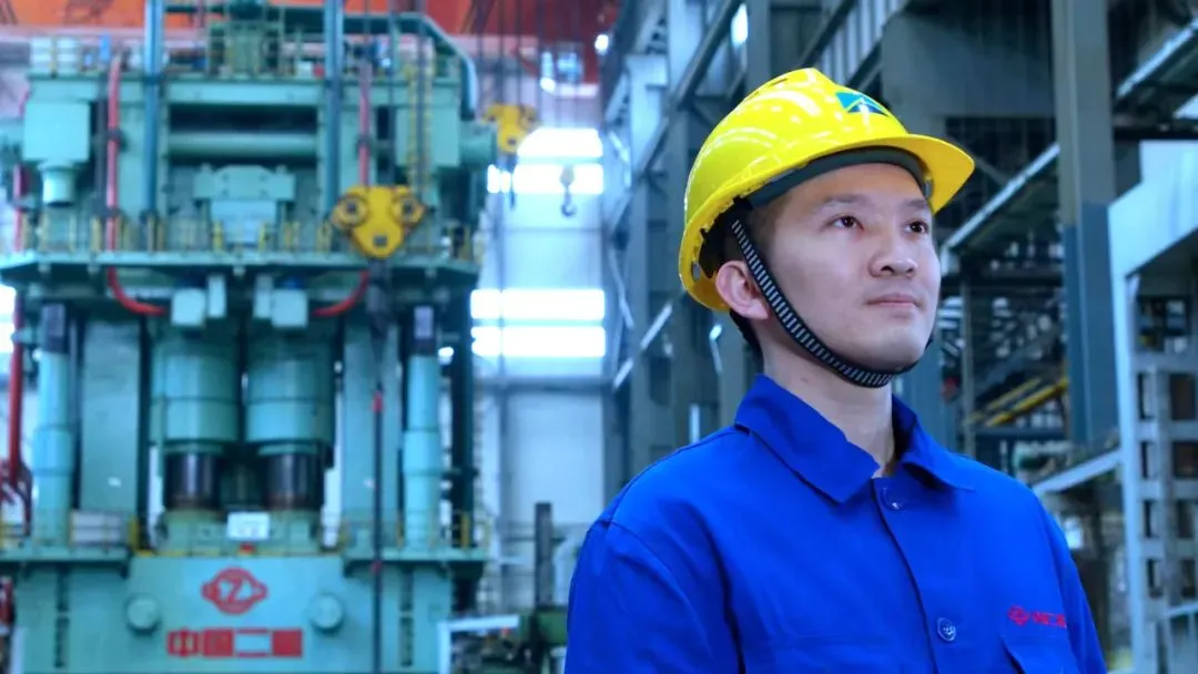 2012年,8万吨模锻压力机正式建成投产,叶林伟通过层层选拔成功入选大压机首批6人操作团队。8万吨模锻压力机高达42米,相当于15层楼房的高度,总重量达2.2万吨,通过液压泵驱使高压缸,能在瞬间产生高达8万吨的压力。这样一个“大家伙”,却是用来为C919这样的大飞机锻造正负误差控制在一毫米内的高端精密模锻件。