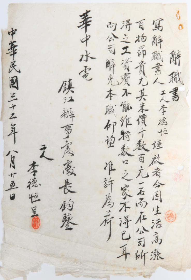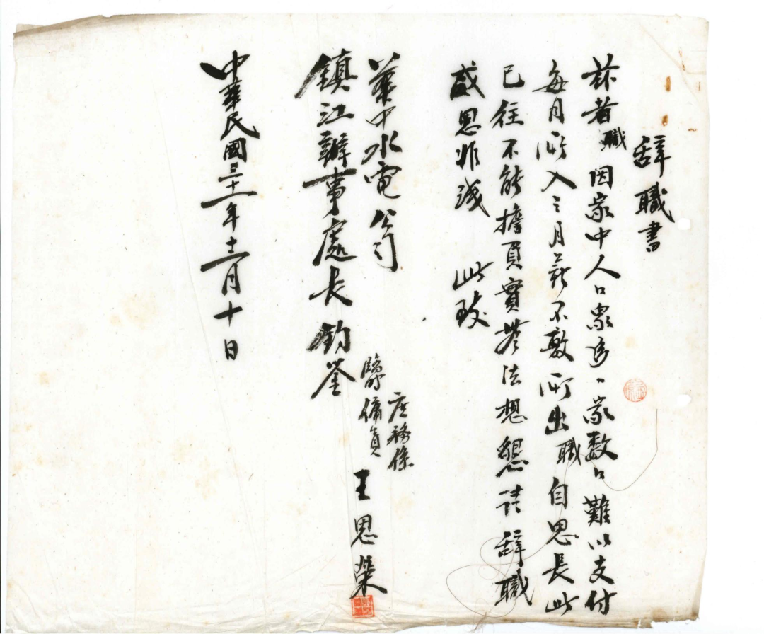 从1941年至1944年,镇江地下党组织多次发动水电公司员工辞职抗争,给敌人的军工生产造成了巨大破坏。目前仅存的20封辞职信,是当年轰轰烈烈的辞职运动的珍贵缩影,更是电力工人在党的带领下开展反侵略爱国运动的历史见证。