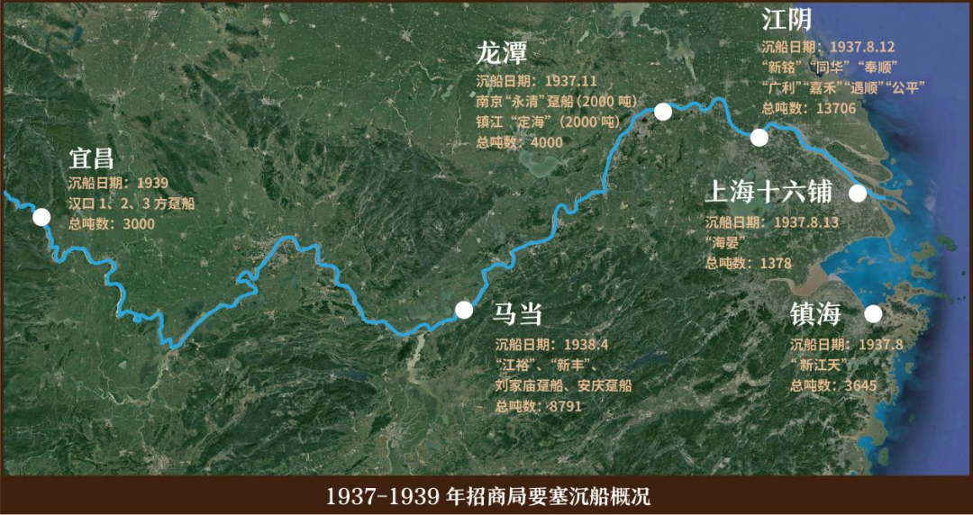 1937年8月,淞沪会战的炮声打响。日军调集重兵封锁水路,企图一举沿江西上。为阻挡和延缓日军进攻,我方决定采用堵塞办法,征用部分航龄较老且不宜行驶于内河的船只,自凿沉于江海各要塞,阻断日本海军西进的通道。作为民族航运业的中流砥柱,招商局当即响应号召、慷慨应征。从江阴到马当、吴淞口到田家镇,1937年至1939年初,招商局在要塞沉船 24 艘,占招商局船舶总吨位的40%,成为抗战时期沉船吨位最多的民族航运企业。一艘又一艘装满石块的铁船用铁链相连,迟滞了日军的进攻速度,为中国军民及大量物资后撤赢得了宝贵时间。