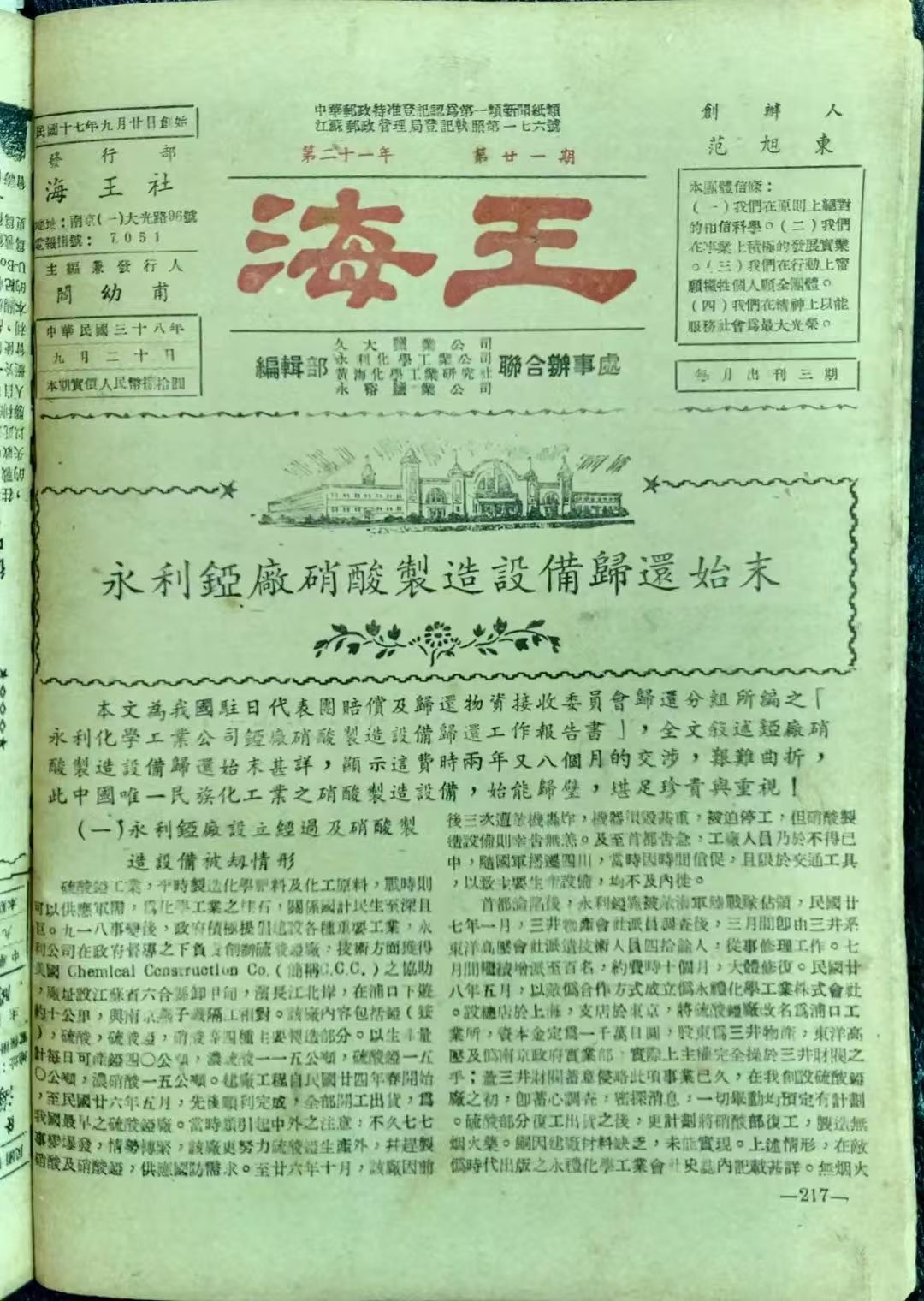 抗战胜利后,永利人回到工厂发现硝酸设备不翼而飞。侯德榜带领同人与盟军经过多次谈判交锋,据理力争,终于索回全套硝酸设备。1952年硝酸装置原址安装重新投入生产,为新中国经济建设做出重要贡献。