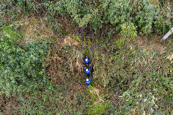 到了目的地,一行三人先趟过山下的一条河,没走几步,群山便将他们“淹没”。山上多是密不透风的茂林野竹,他们先用锋利的劈刀开路。因山势太陡,再加地面潮湿,稍不小心就会滑倒,有时还会被带刺的荆棘扎伤。下山时,为了节省力气,他们会像滑滑梯一样直接滑下去……